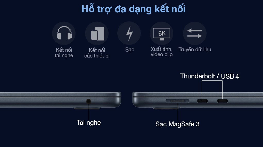 Cổng giao tiếp Thunderbolt / USB 4 hỗ trợ kết nối phụ kiện với tốc độ cao, kết nối với màn hình độ phân giải lên tới 6K và cũng có thể sạc máy khi bạn quên đem theo sạc của máy. Sạc nam châm MagSafe 3dễ dàng cắm vào, rút ra, phòng tránh các sự cố rơi làm rớt máy.