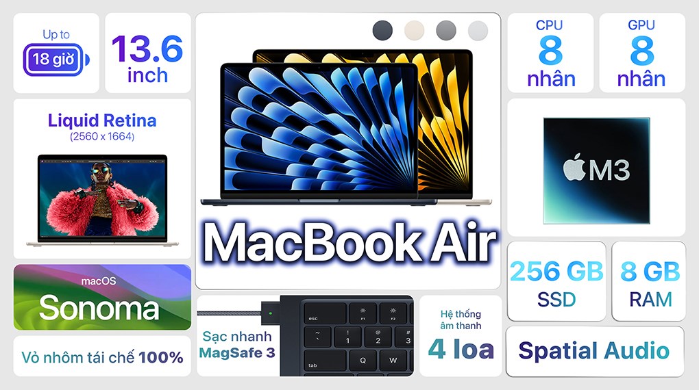 Tiếp nối những thành công mạnh mẽ từ phiên bản Macbook Air M2, thì nay MacBook Air M3 đã quay lại thật bùng nổ vào những tháng đầu 2024 này. Với con chip M3 cải tiến tuyệt vời, ngoại hình đến tiện ích "miễn chê" sẽ cho bạn trải nghiệm những chế độ công việc tuyệt vời.